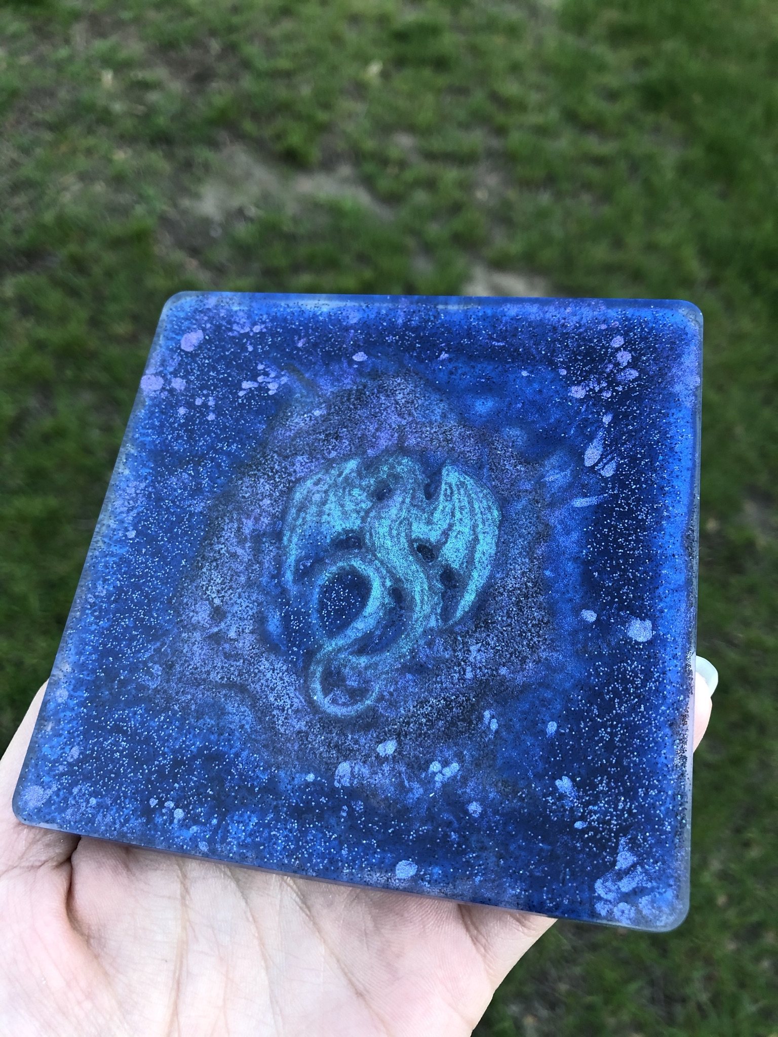 Sparkling blue square coaster with color shifting pigments and an embedded dragon.