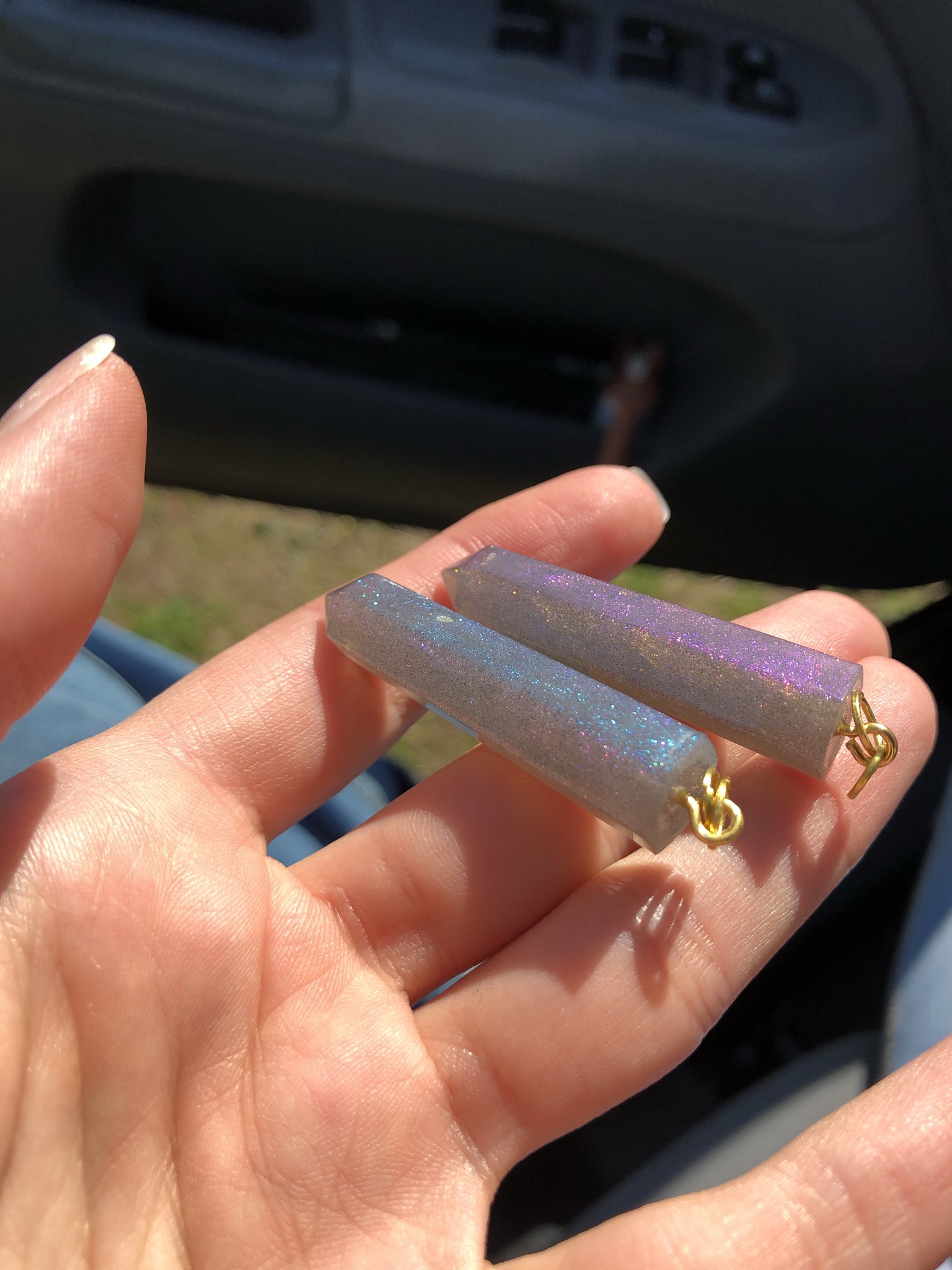 Faux stone pendants of various shapes made with color shifting pigments.