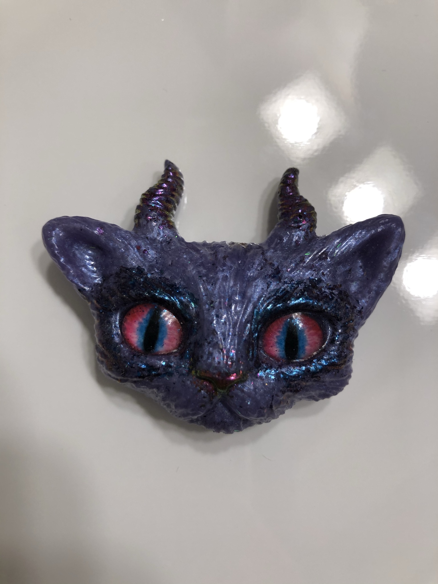Pearl purple UV resin Horned Cat magnet with pink eyes.