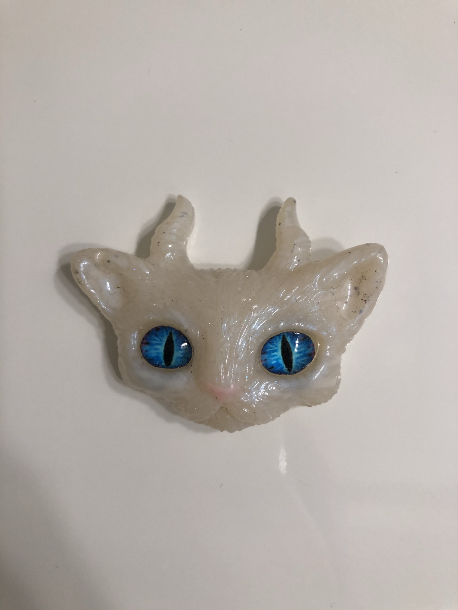 Pearl white UV resin Horned Cat magnet with blue eyes.